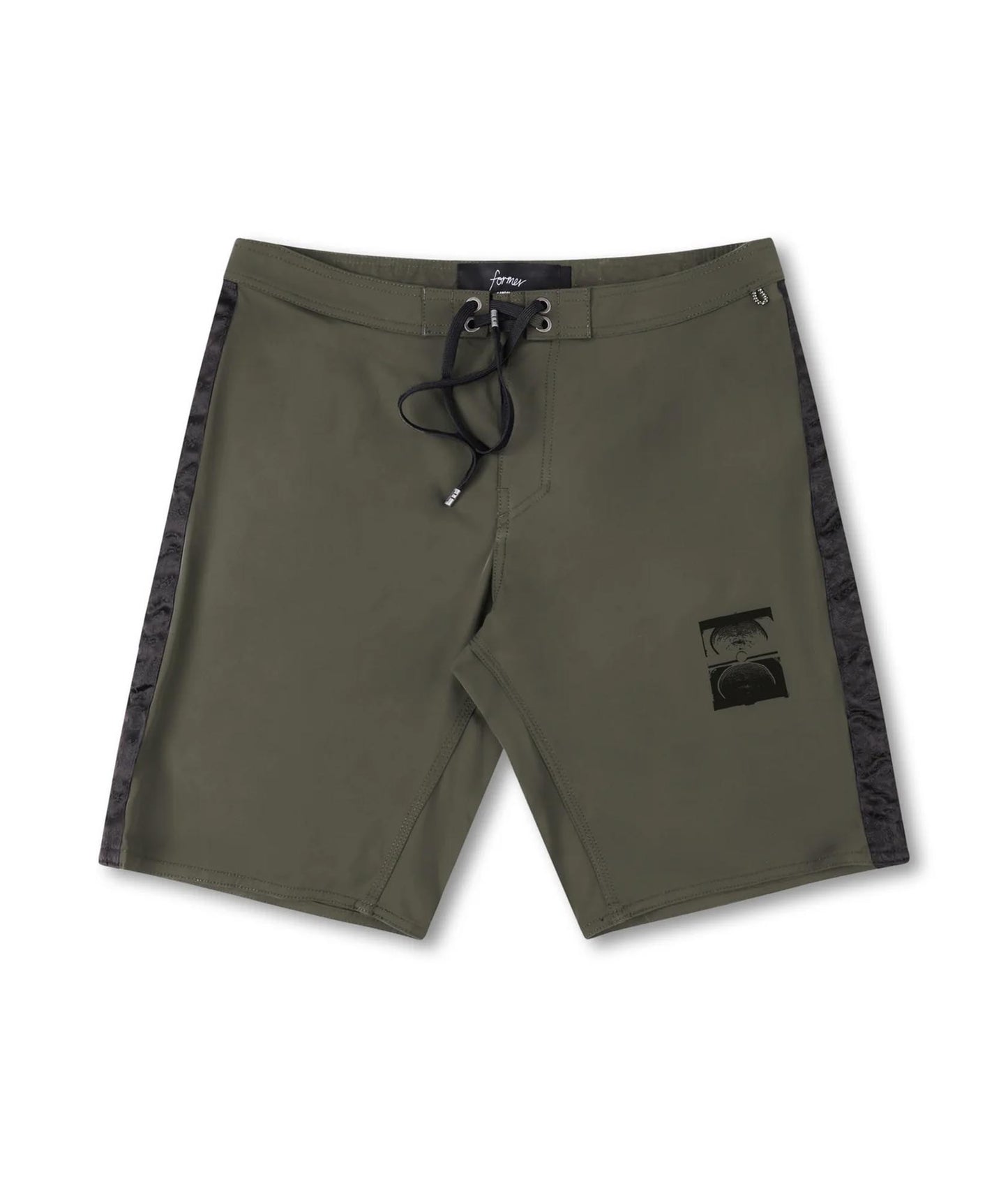創設者、クレイグ・アンダーソンによるデザイン。プレミアムナイロンとスパンデックスのNyLuxストレッチ素材を使用しています。ジャカードサイドパネルテープ、ヒップポケットにはレガシー織りジッパータブの見えない隠しコイルジッパー、内部に伸縮性のあるキーループ付き。ロゴスクリーンプリント、FORMERブランドのメタルアグレット付きドローコードクロージャーが特徴です。