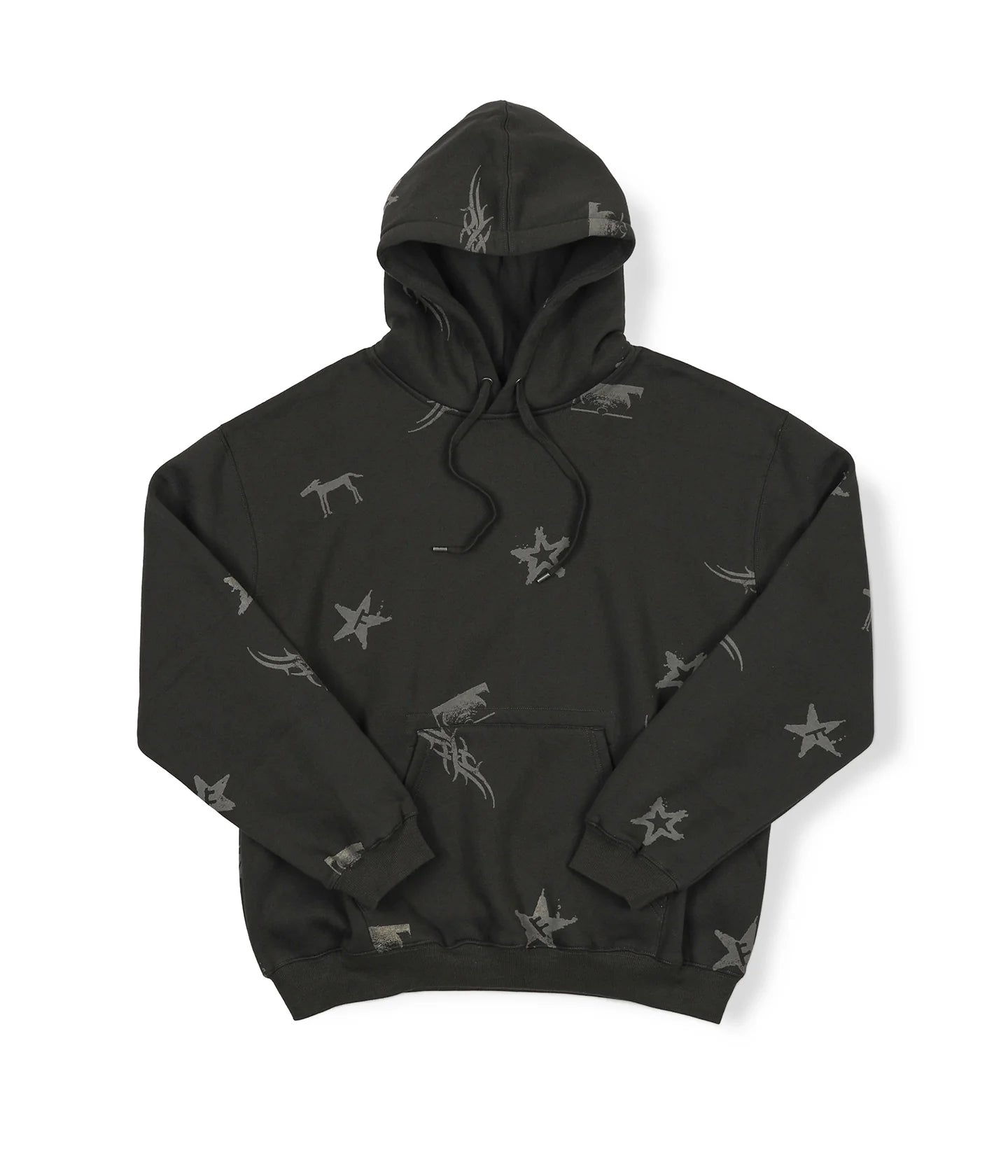 ウォッシュ加工を施したブラックカラーに、ショーンのデザインによるプリントが総柄であしらわれている。オリジナルのメタルアグレットと、袖口のフランチャイズFの刺繍が特徴。