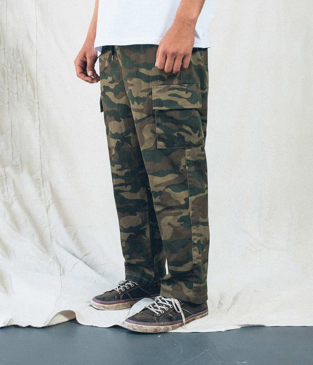リラックスしたテーパードフィット、ウエストは伸縮性があり、ドローストリングで調整可能。 ネオンオレンジのトライバルロゴの刺繍、オリジナルカモ、オリジナルリングジップが特徴。