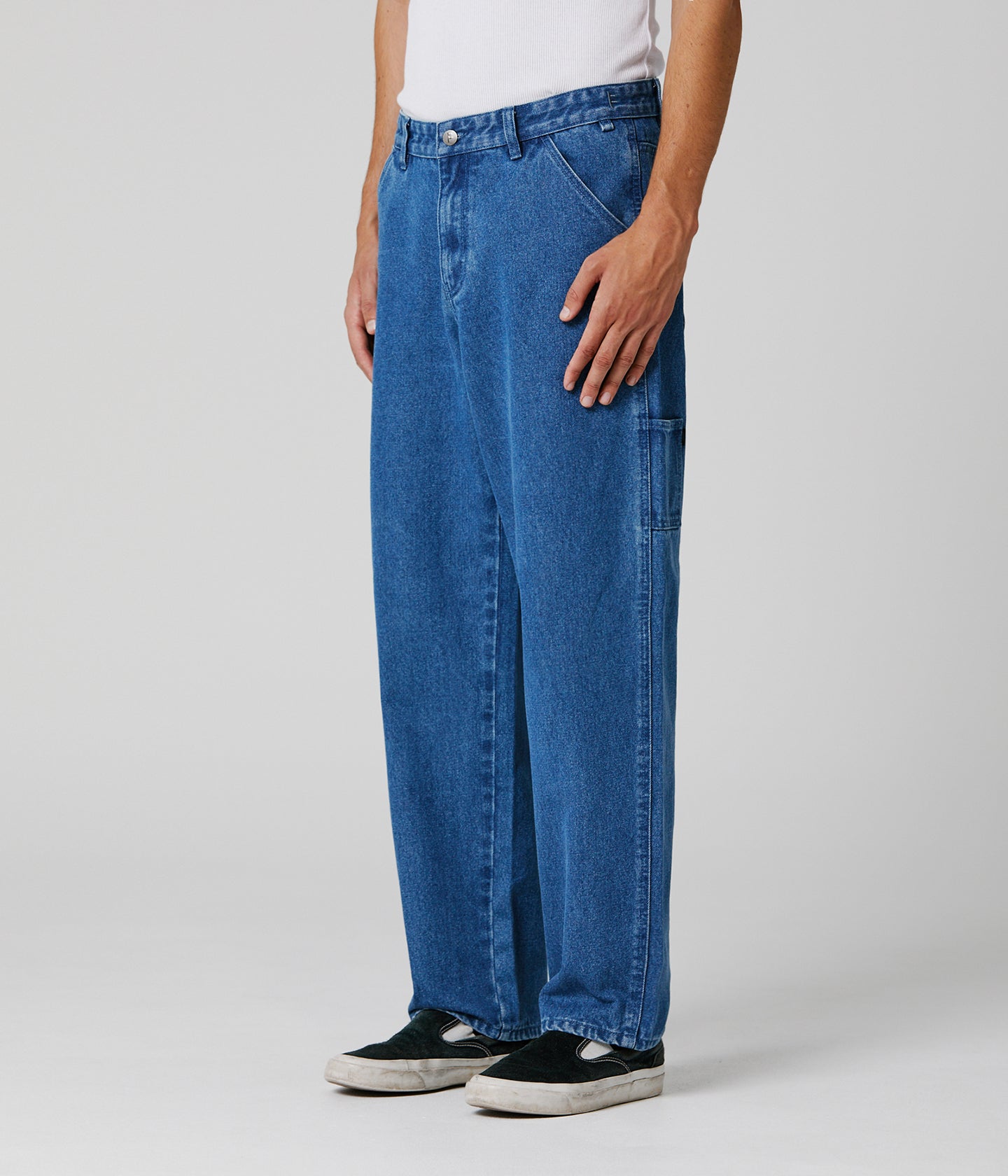 ワークウェアのようなデニムは、ヘビーウェイトで丈夫な100%コットンデニムを使用し、ディステンドバギーストレートフィットに仕上げられている。
