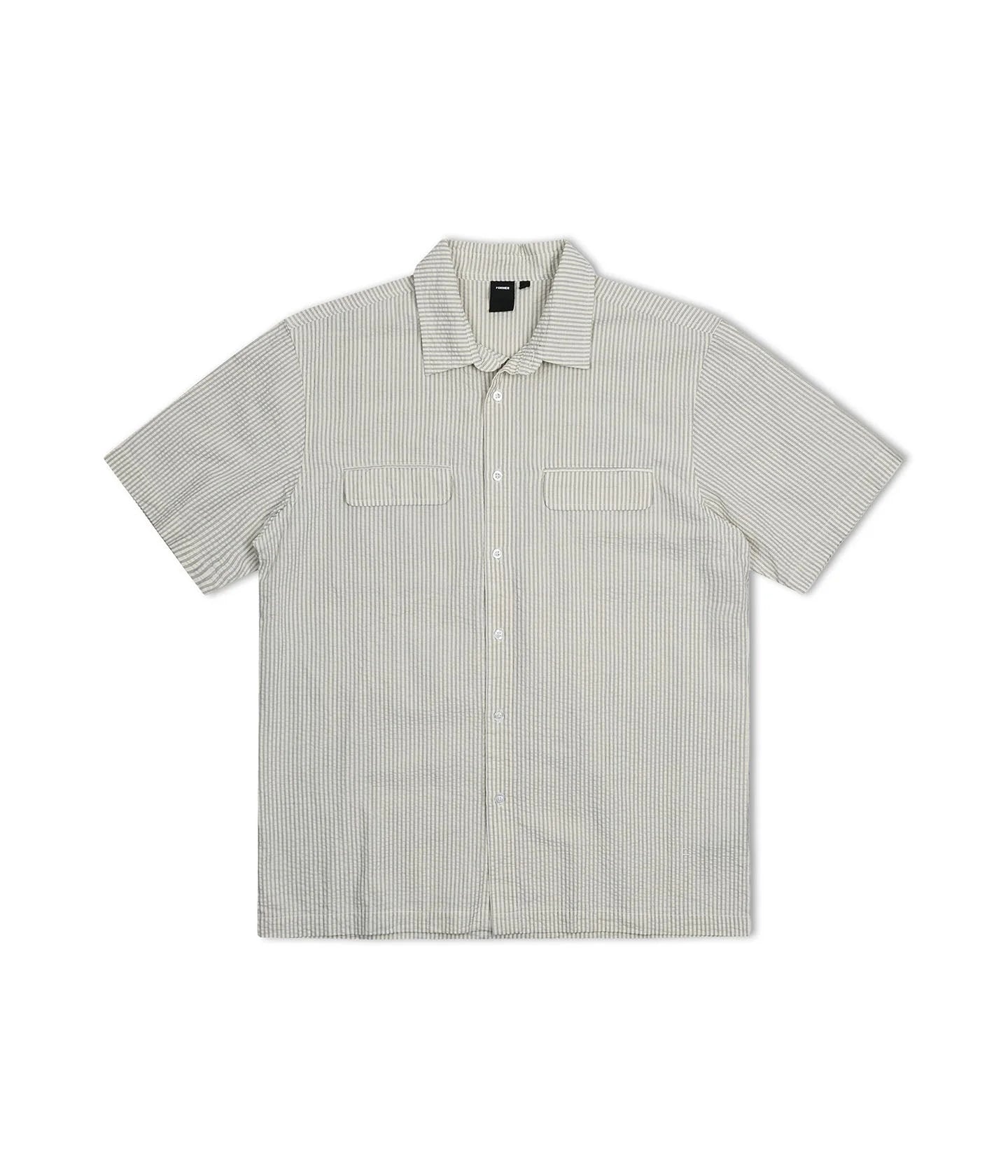 軽量のシアサッカー素材にピンストライプをあしらった、高級感のある半袖シャツ。ゆったりとしたシルエットのビビアン・シャツ・フィットで、ガーメント・ウォッシュとフランチャイズFの刺繍が特徴です。