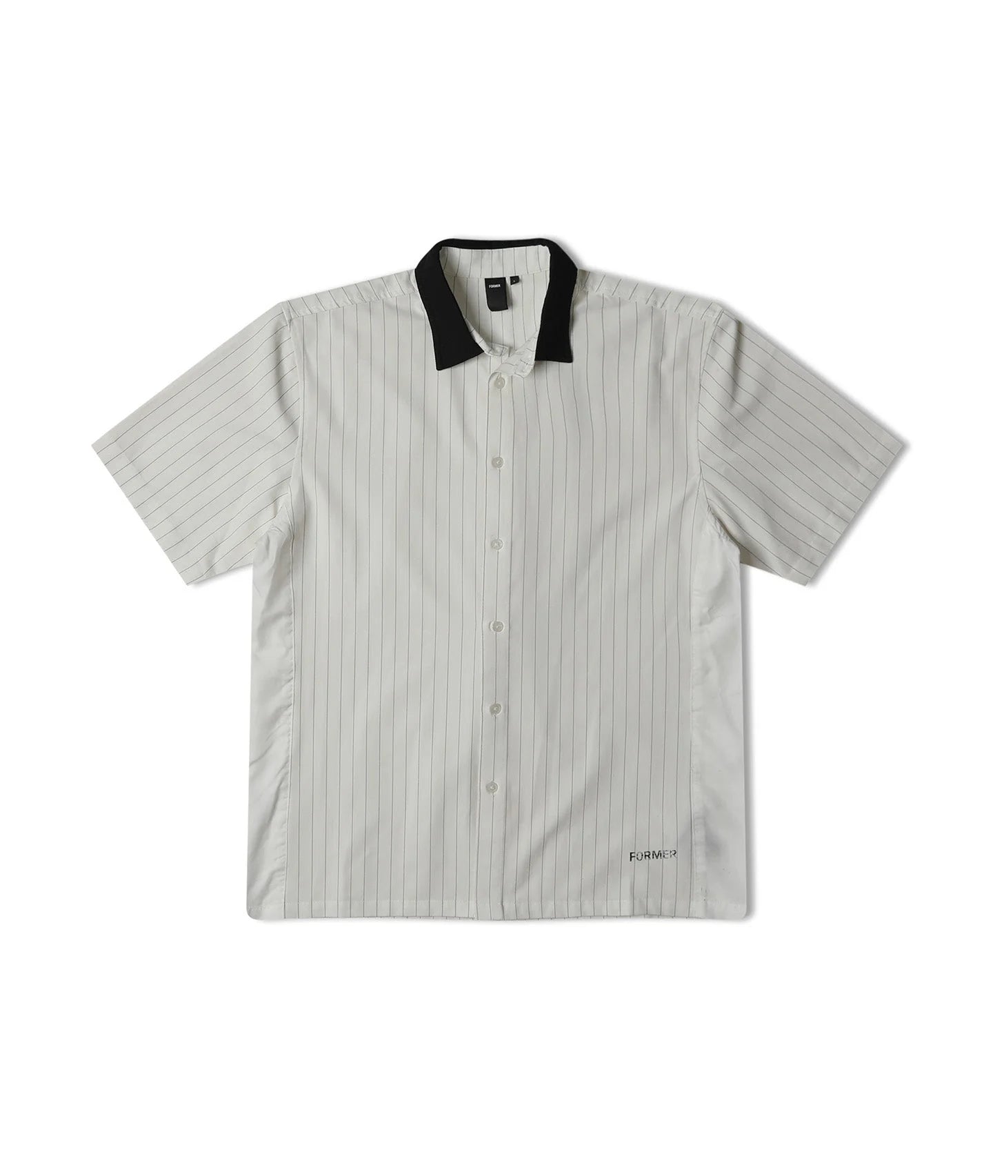 OUR SEASONAL PINSTRIPE SHIRT IS CONSTRUCTED FROM A 63% POLY 33% RAYON 4% SPANDEX RAYON BLEND WITH A 100% TENCEL CONTRAST COLLAR. DELIVERED IN OUR FORMER VIVIAN SHIRT FIT WITH INTERNAL WOVEN LABELS, OUR FRANCHISE F EMBROIDERY, AND A CONTRAST COLLAR DETAIL.