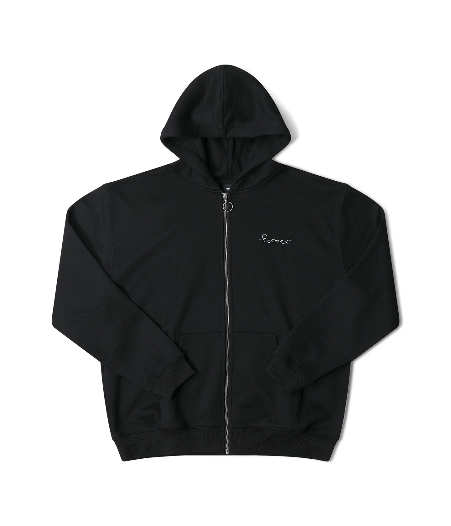 コットン50%、ポリ50%の混紡フリース素材を使用。フロントとバックに刺繍とスクリーンプリントで今季のグラフィックをあしらったフロントジップフーディー。FORMERオリジナルドローコードとディテール。